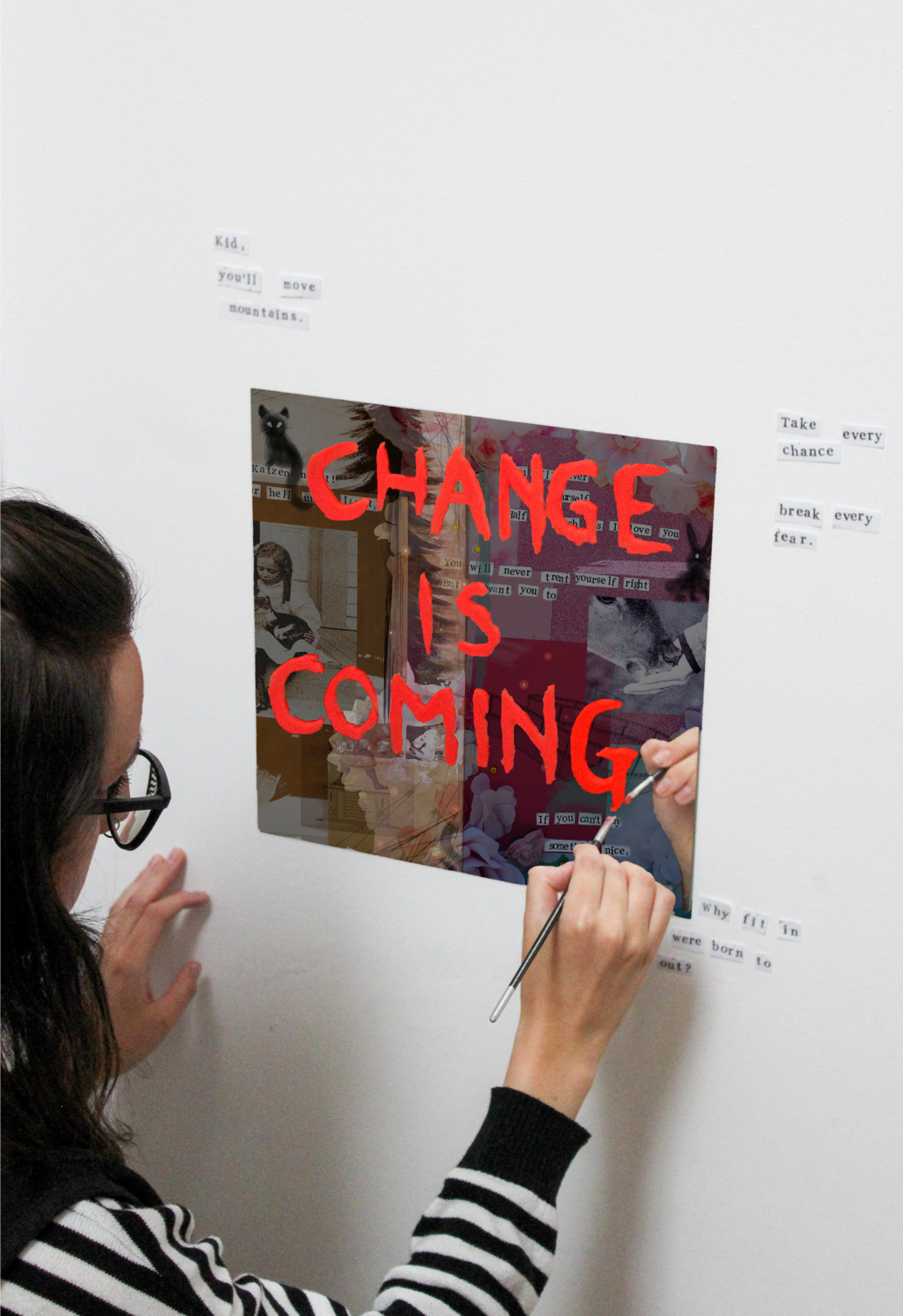 Stella is intrigued how strongly children can be shaped by stories and fairy tales in their upbringing. And what they should be taught so that they are best prepared for the challenges of today and tomorrow. The Franconian artist uses fairy tales, symbols and colors to set the scene for three different styles of upbringing. The picture, which is covered with red writing, is divided into two parts: The left half refers to the so-called “poisonous pedagogy”. Brown, muted colours and a dark fir forest symbolize the fearful mood of the children during this time. The partial image is supplemented by texts and graphics that refer to the German fairy tale „Die gar traurige Geschichte mit dem Feuerzeug“ („The Sad Story with the Lighter“) from Heinrich Hoffmann‘s Struwwelpeter. These are a cynical reminder of the educational slogan of the time, „Who will not hear, must feel.“ The right half shows the fairy tale world of today. In addition, text excerpts that come from the American fairy tale „Bambi“, by Walt Disney. Its characters are heroes who improve the world, afflicted with role clichés and stereotypes. An ironic allusion to the fact that such a pink-one-dimensional world is just as fake as the one-dimensional one of fear pedagogy. As a layer on top of these two, she has placed a third image: the artist herself stands there and writes „Change is Coming.“ But in which direction? Reflection is necessary, says Stella Wingerter. Quotes from U.S. children‘s author Theodor Seuss Geisel frame her mural: They emphasize that change is possible for everyone. Even if we have been shaped by negative experiences. Aware of the experiences we have had, the message goes, we are able to develop new perspectives, to shape change and a future-oriented education for children. An education that makes children and young people strong and enables them to cope with the complex challenges in their lives.