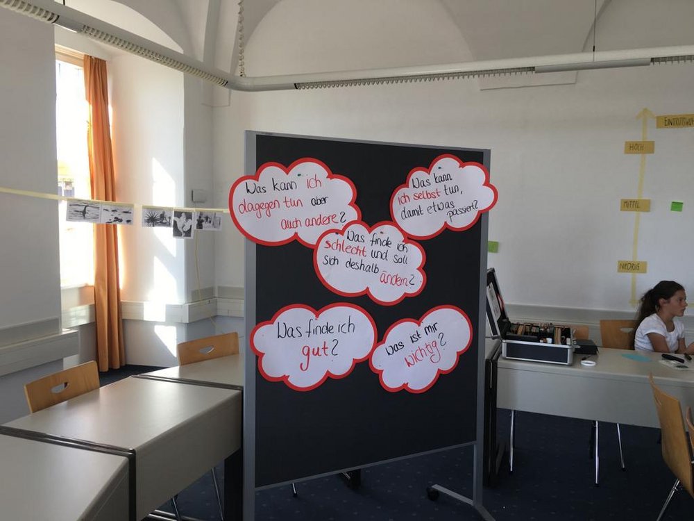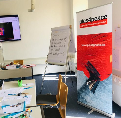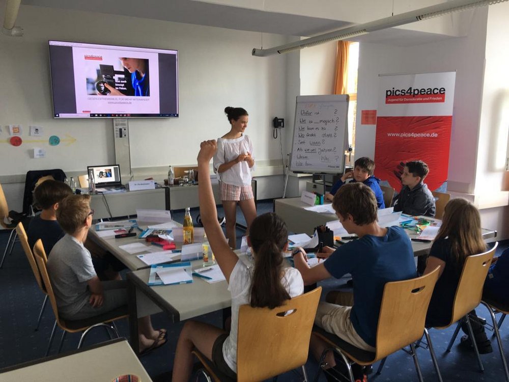 Kids between the age of 10 and 13 work on the topic "Political Photography" and "Photographic pics4peace - Together in Europe?!", so cool! How did it come about? The HSS had asked Anna and Pia to create a vacation workshop. While Anna focused on the many aspects of political photography over several days, Pia's workshop yesterday was about concretely working on topics that move young people and how they can create their photographic pics4peace.