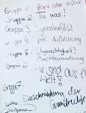 "Do something!" was also the appeal of the second group: there is a lot of discussion and regulation, but consistent action is lacking, as one student pointed out using the example of climate conferences.Other topics included the exploitation of positions of power leading to quick and unjust actions, as illustrated by a school example, but also the Syrian conflict and the irrational actions of the presidents of Russia and the U.S., which concerned the young people: "What can be done about it?"