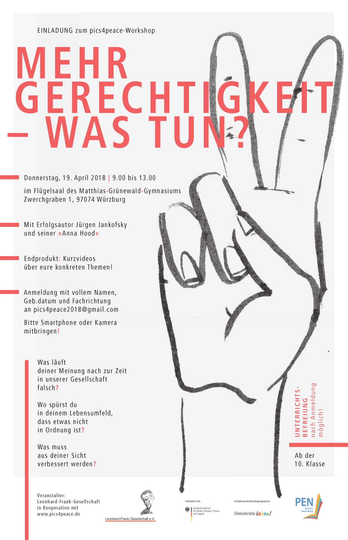 Würzburg. In a five-hour pics4peace workshop, organized by the Leonhard Frank Society in the large hall of the Matthias-Grünewald-Gymnasium, about 70 young people, with successful author Jürgen Jankofsky, worked out what needs to be done to make things fairer in our society.