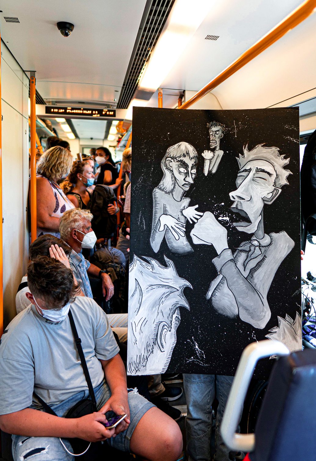 The visual artist and musician FINN STANGLMEIER suffers from the interpersonal consequences of the Corona pandemic. He had to experience that many people became more unfriendly, more distrustful, sometimes even verbally abusive also on himself. The physical distance made necessary by the pandemic grew into a mental distance with each month of further lockdowns and minimum distancing. Finn's surreal, comic-like figures speak for themselves: exaggeratedly large, striking and expressive, the visibly suffering. Surrounded by evil-looking eyes, disparagingly tilted corners of the mouth, anger-distorted grimaces; a fist raised in a threatening gesture, hands accusing. - Hostility captured on cardboard. The Augsburg artist confronts people on a crowded train with this. The oversized painting is disturbing. The life-size man in the painting, coughing and spreading viruses, seems like a provocation in the dense crowd. But the faces of the passengers, hidden behind masks, remain uninvolved, averted. No one asks questions, seeks contact. Everyone focuses on himself. - Interaction has died. An image that also questions our behavior. In another installation, he placed the image in the boiler room of the catacombs under the museum of the monastery. The abandoned cellar room - architectural symbol of the loneliness of each individual during the pandemic and of being reduced to oneself. Under the ground, trapped behind thick walls, it is impossible to see beyond. The valves and pressure gauges - signs of the pressure that the introduced Corona measures put on the individual and cannot be released. Finn Stanglmeier‘s work shows how the dealings with our fellow people has suffered. Covid was something new. There will be more pandemics. How to deal with it must be learned, the multifaceted suffering of people must be minimized. The tension-laden works virtually urge for a resolution, for attention instead of ignorance, for conversation instead of silence, for trust instead of mistrust. They invite us to reconsider our own behavior.