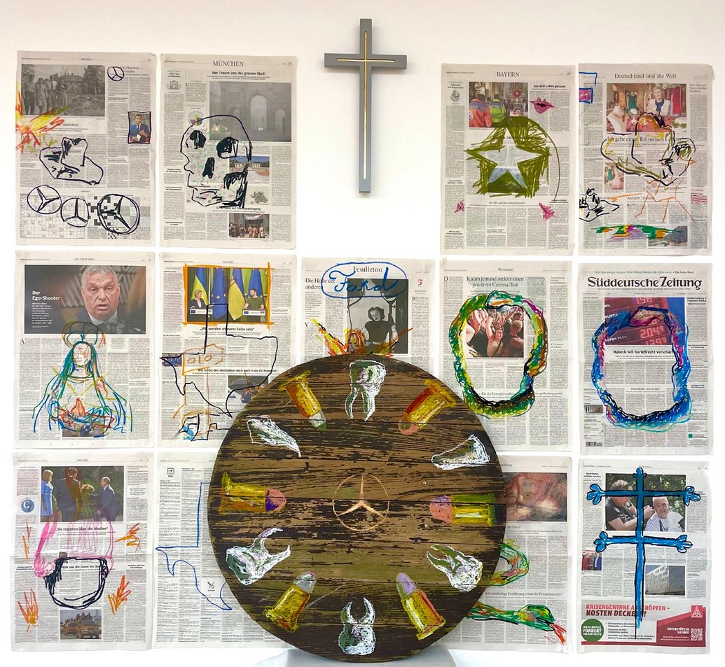 History, war and art exert a great influence on the fate of people. Finley Jacobsen is sure of that. He therefore devotes himself to remembering and forgetting. His work „Mercedes in War and Peace“ serves as an example. Finley Jacobsen says that every remembrance is accompanied by a distortion of the truth, whether intended or not. Similar to the retelling of stories. That‘s why he tries to get to the root with his art. He implicitly raises the question that everyone can ask: How would history have to be told from as truthful an observation as possible? For his artwork, Finley stages a found object from the vicinity of his German workplace: a discarded wooden well cover. It was a chance find: visibly robbed of its function, lying around carelessly, abandoned to successive rotting. Like sometimes aspects of our history. This wooden disc becomes the center of his altarpiece. Finley carves a Mercedes star into the well cover. He frames it with painted teeth and cartridges. They symbolize human sacrifice and gun violence. Painted pages of a German daily newspaper form the altar panels, which open upward to a cross. Simplistic symbolic drawings adorn the current news stories, which include the forward push of the autocracy, the state of our nature, the pandemic, the economic crisis, the war in Ukraine, worldwide protests, but also people in difficult situations. Finley deliberately paints over the information communicated as truthfully as possible through good journalism in a childish crude manner: