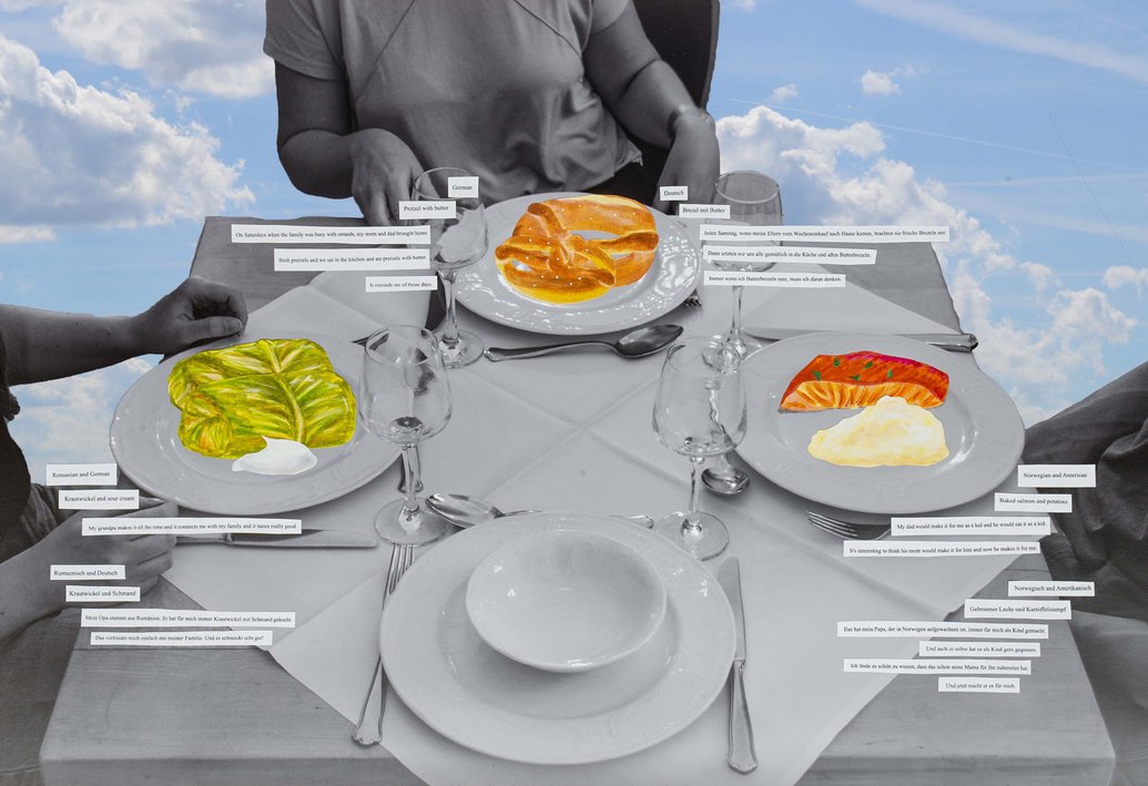 The United States of America is made up mostly of people who immigrated at some point. They have different cultural backgrounds, customs and habits. In Germany and Europe, too, diversity in the population is increasing, partly viewed with reservation. Disputes often arise because we focus on what separates us. This prevents us from coming together. But what could unite us all? Is there a common ground that is emotionally comprehensible for all people? Almost atavistic? That has always been like that? Nuala Kennedy found it in food. A basic need all over the world at all times. For her project, she asked 17 people of different ethnicities about their „comfort food,“ that is, a favorite food that gives them a special feeling of wellbeing. The artist from the States received a variety of answers. A variety of personal stories that were behind each choice. Some favorite dishes were very culture-specific, others more international. However, they all had one thing in common: they made people happy and reminded them of something meaningful. Nuala asked three people to take a seat at the set table. They were talking animatedly. Nuala was able to photograph the scenery unnoticed. Then she drew the favorite dishes of the three on paper, cut them out and placed the paper dishes on the empty plates of the photo. She added to the image the autobiographical statements of her protagonists, in different languages. While the deceptively real-looking food on paper on the plate shows that it is interchangeable, the multilingual texts illustrate that this is about all the people in the world. Finally, Nuala Kennedy set the scene free and inserts the image of the open sky as a ceiling as a sign that it does not end here. A call to think about what connects us as humans. The front seat at the table is free, the plate empty. Do I join them? Do I talk to the others about my food experiences and my story? Am I interested in theirs?