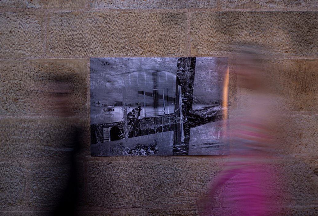 Priscilla Groß‘s pittura oscura consists in four superimposed photographs. Three black-andwhite photographs merge with each other, forming the center of the fourth photograph as a picture within a picture. The composition deals with the concept of „loneliness“ on different levels: The three black-and-white photographs cast a haunting, intimate gaze on signs of loneliness: > A close-up of the window cross of an orphaned attic lookout, on whose rung a stray butterfly sits trapped, gazing in vain at freedom. > A lonely cross, visible only as if through fog. In the feeling of loneliness everything becomes unreal and loses its contour. > The view of the back of an out-of-use construction trailer in the middle of the forest, barely recognizable. It has been parked and taken down, abandoned, without purpose. Priscilla integrates these three photographic perspectives on loneliness into a new reality in her pittura oscura. The butterfly suddenly finds itself in the car, whose transparent-looking backside wraps itself protectively around it. The cross seems to be perpendicular to the cross of the window, pointing a way out. While in other places boundaries blur, the signpost in front gains contour and sharpness. A way out of loneliness seems possible. In the next step, Priscilla Groß installs her photograph on the wall of an educational center, right into the middle of life. A crowd of young people run past it. They pay no attention to the multi-layered expressions of loneliness in the picture on the wall. Their rapid movements are directed toward their next destination. The artist relentlessly captures this as a color photograph without a filter: People blur as they hurry past being only dimly discernible, not really present. The installation shows that one can feel abandoned even among many, physically present or online. With her work, Priscilla Groß wants to draw attention to the phenomenon of loneliness in crowds. She wants to encourage people to go through the day with open eyes and pause to meet other people more empathically. A crucial step in breaking down the loneliness of the many overlooked.