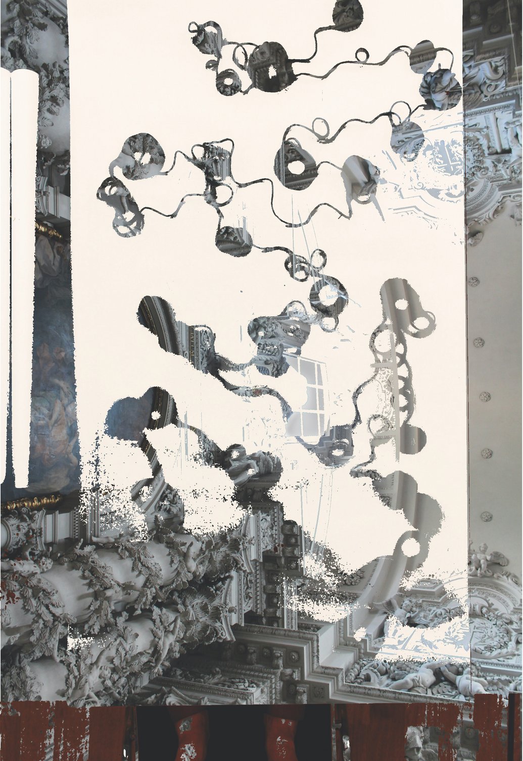 Who doesn‘t long for love and acceptance? Who doesn‘t long for orientation in these complexly difficult times? Natalie Bultman‘s pittura oscura is therefore entitled „Deep Yearning“. The devout artist deconstructs the religious and transfers it to all people in a thought experiment: The construct made of natural string shows the winding path of her and our search for fulfillment. She places the construct in the photograph of the vaulted ceiling of a baroque pilgrimage church. The space widens, is bright and open to the sky. Our path of longing approaches this space of hope and finds its goal in it. Natalie shows a way how the deep longing in people could find its correspondence: Instead of the many commands and prohibitions, instead of the hierarchies and their negative excesses in our religions, all believers would have to have a personal relationship with God that is characterized by openness. A relationship that shows itself through the spirit of supporting and serving each other. If all people in the world lived in this spirit, then everyone would treat each other with respect and consideration. Conflicts would be solved in a completely different way. In such a community, everyone would feel accepted and loved. Natalie expresses it this way: „The images I created address the complexity of finding the truth. I showed this complexity through the winding cord in my work. When it seems that much of religion seems distant or burdensome, a deconstruction of the term “religious” must occur. Jesus explained church as the fellowship of believers serving each other – not as the name of a building. Thus, the cord in my work continues to stem from the church into a new, open space. My work shows how fulfillment and the presence of God can be hard to find amidst rituals, fear of punishment, tradition, politics, etc.. But in the end when He is found, the closeness of a relationship with Him is simple and incredibly beautiful. You feel accepted and loved.
