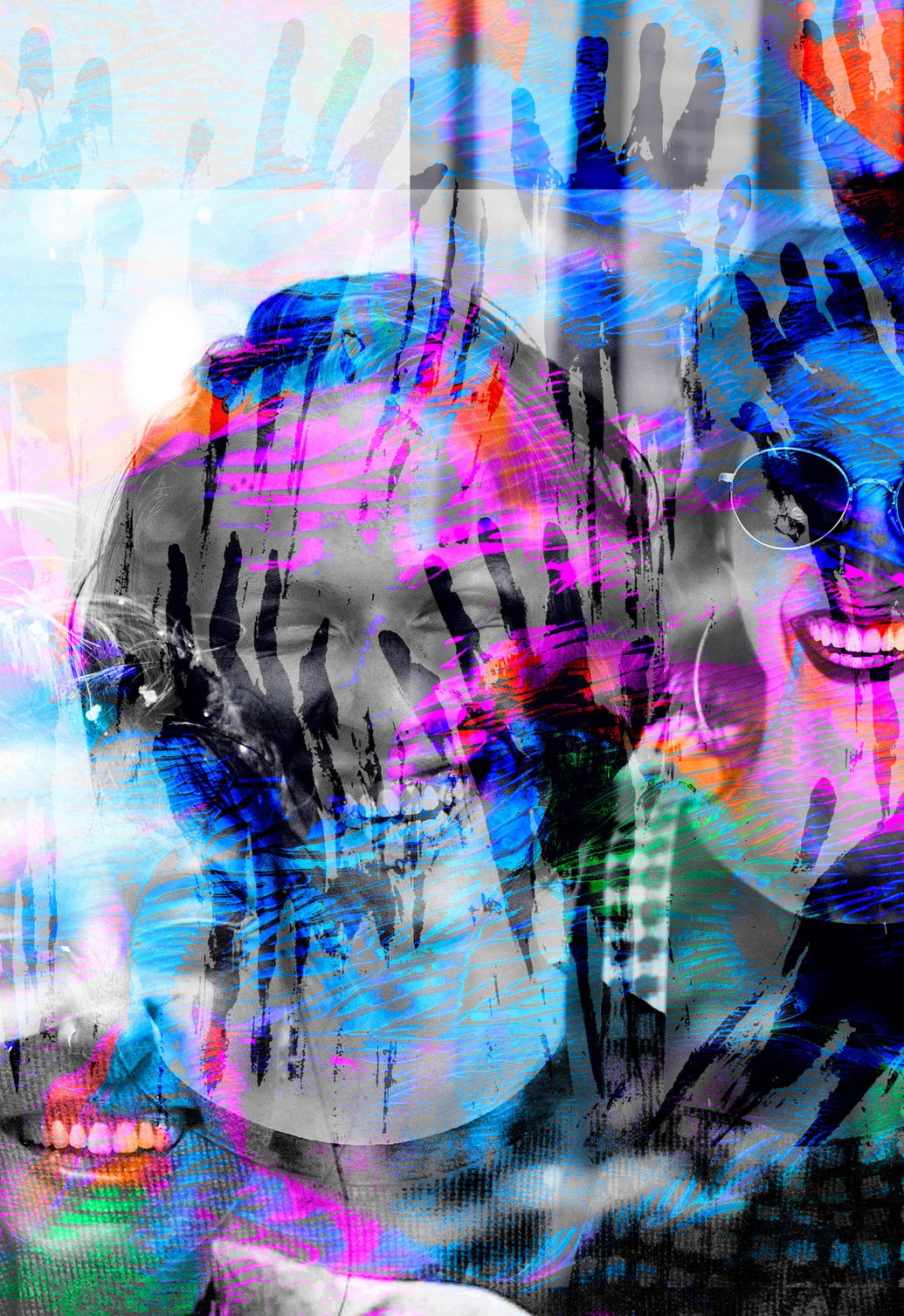 No generation has taken as many photos of itself as ours, Selina Pfeil notes. Almost all of them show smiles. But what does it look like behind the facade? More and more young people around the world are suffering from mental illness. Suicide rates are also on the rise. The title of her work „Your Psyche - No Taboo“ is her call. Over the seemingly cheerful laughter, the Plauen artist puts her black colored hands, presses them on paper, pulls them away, lets them reach into the void. Black hands everywhere - dark, mute - symbol of a cry for help that cannot articulate itself. Radiant on the outside, empty on the inside. This is a clinical picture that has entered the medical textbooks with „smiling depression“. Pressure to succeed, superficial relationships, such as those built up via social networks, and the motto „Can‘t do, won‘t do,“ lead to these consequences, according to the young artist. Thus, the most natural thing in the world, namely to talk to others about what is bothering you, becomes taboo. The inhibition to express oneself grows with the problems. You keep everything bottled up. The subjective impression arises: one is inferior. At some point, all you can see is a big black hole. It can‘t stay that way, she is sure. Finally, Selina expresses her counter-design in the color scheme. The color blue, in between discreet but clearly recognizable green components and dominant red tones are the focus. Green stands for hope and that change can grow; blue refers to lightness and feeling free; red is a sign of our inherent life energy. As soon as we get involved with each other again and are open to each other, it can be revived. Helping and accepting help becomes possible when we are interested in each other, trust each other and talk about our problems. Relief becomes perceptible.