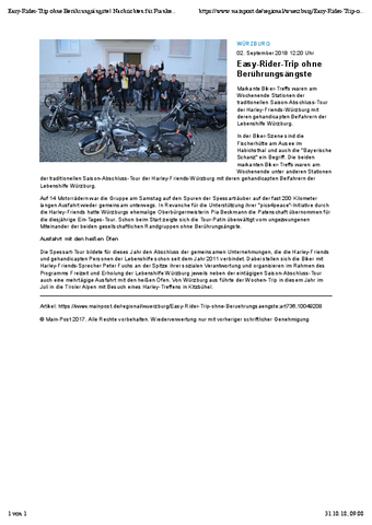 "Auf 14 Motorrädern war die Gruppe auf den Spuren der Spessarträuber auf der fast 200 Kilometer langen Ausfahrt wieder gemeinsam unterwegs. In Revanche für die Unterstützung ihrer "pics4peace"-Initiative durch die Harley-Friends hatte Würzburgs ehemalige Oberbürgermeisterin Pia Beckmann die Patenschaft übernommen für die diesjährige Ein-Tages-Tour. Schon beim Start zeigte sich die Tour-Patin überwältigt vom ungezwungenen Miteinander der beiden gesellschaftlichen Randgruppen ohne Berührungsängste.", so der Artikel von Herbert Ehehalt, Mainpost, aktualisiert am 06.09.2018.