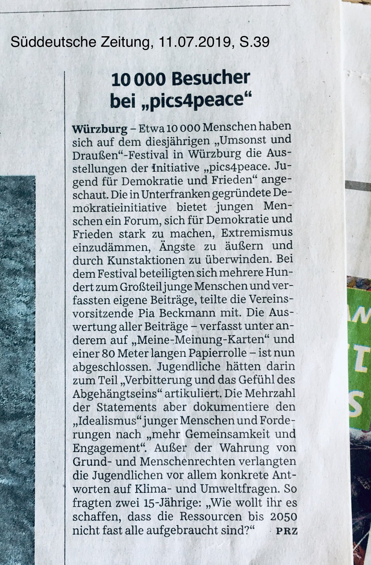 The Süddeutsche Zeitung of July 11, 2019 reported on the evaluation of the pics4peace acticities at the Umsonst & Draußen Festival in Würzburg.