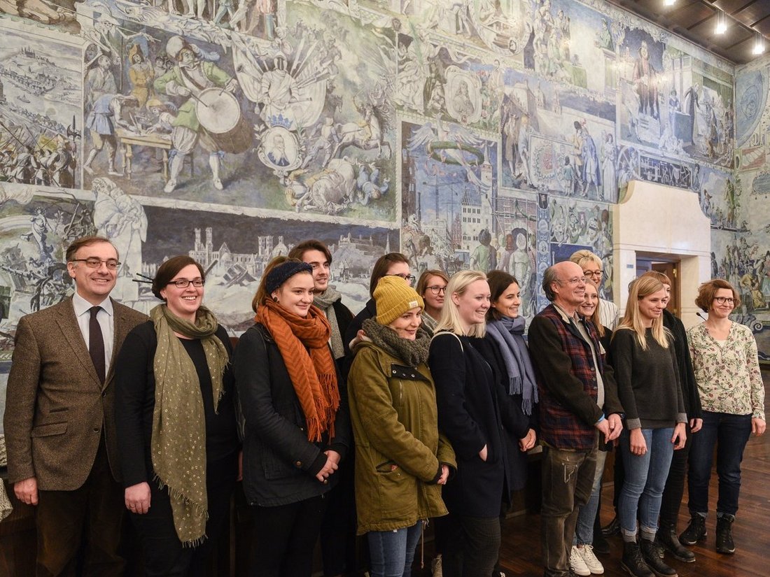 Der aus Berlin angereiste Künstler Winfried Muthesius und die Studierenden machten sich zuerst am Wandgemälde von Wolfgang Lenz, das im Ratssaal die über 1300jährige Geschichte der Stadt in Bildern veranschaulicht, mit den Wechselfällen des Schicksals der Menschen in Würzburg und Umgebung vertraut.