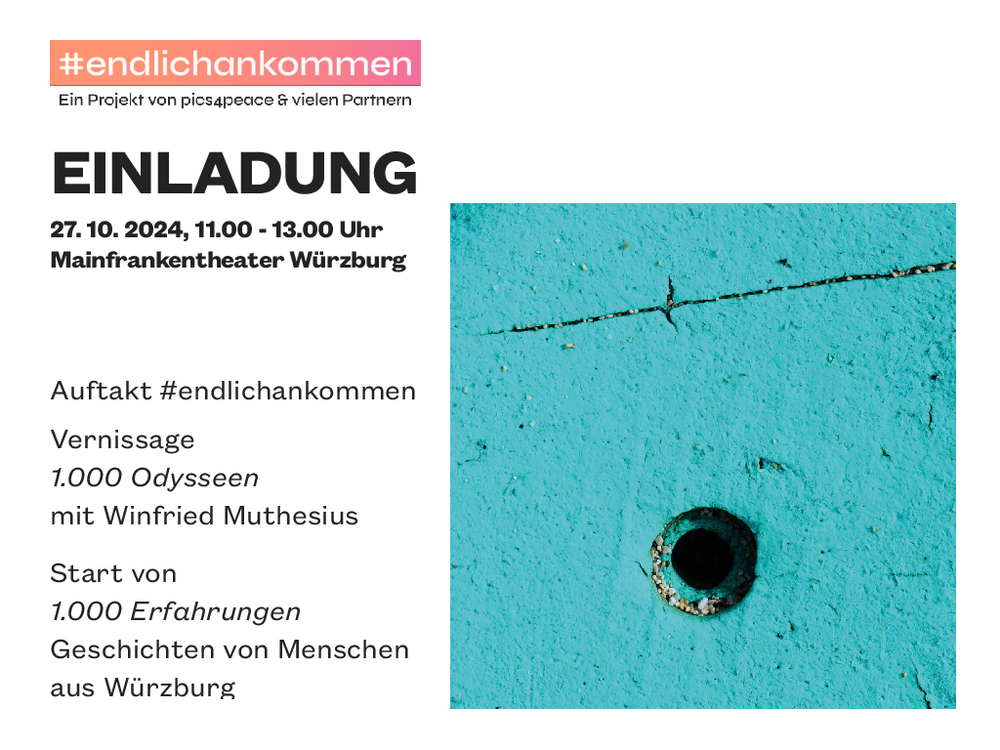 Wir begeben uns auf die Startbahn! Am 27. Oktober 2024 ist es soweit. Nach vielfältigen Vorbereitungen laden pics4peace und das Mainfrankentheater gemeinsam zum Auftakt von #endlichankommen und zur Vernissage der Ausstellung "1.000 Odysseen" ein.