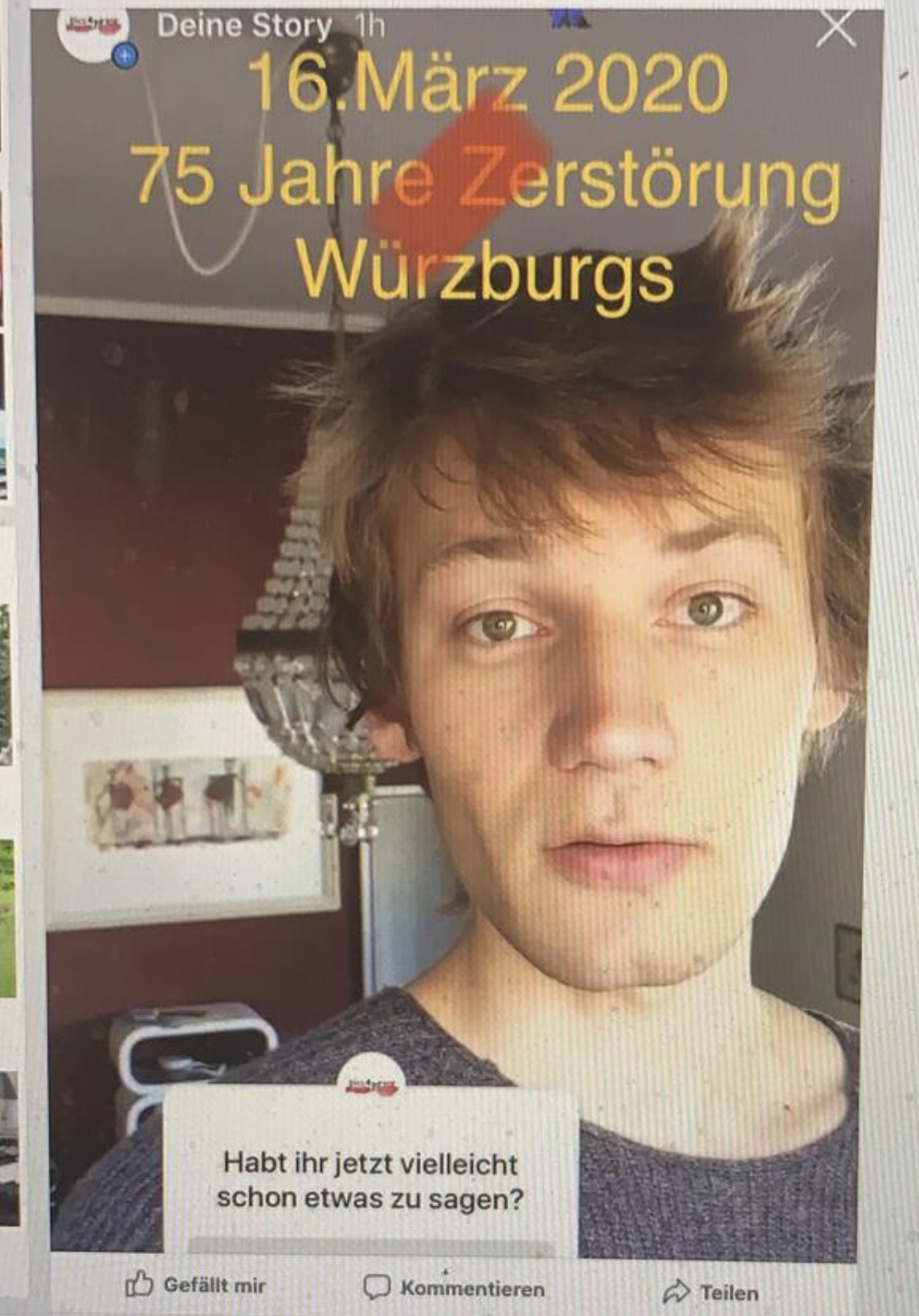 Doch nachdem das Virus Covid19 so ziemlich alles durcheinander bringt, auch die Aktivitäten zum 75. Gedenken an die Zerstörung Würzburgs, und daher der Gedenktag vor Ort ausfällt, haben wir uns entschlossen, unsere Aktion virensicher online auf Instagram, Facebook und am Ende als Ganzes auf YouTube zu bringen. Lucas postet die selbstgedrehten Videos auf Instagram und fasst sie am Ende zu einem Film zusammen, der auf unserem YouTube-Kanal zu sehen sein wird.