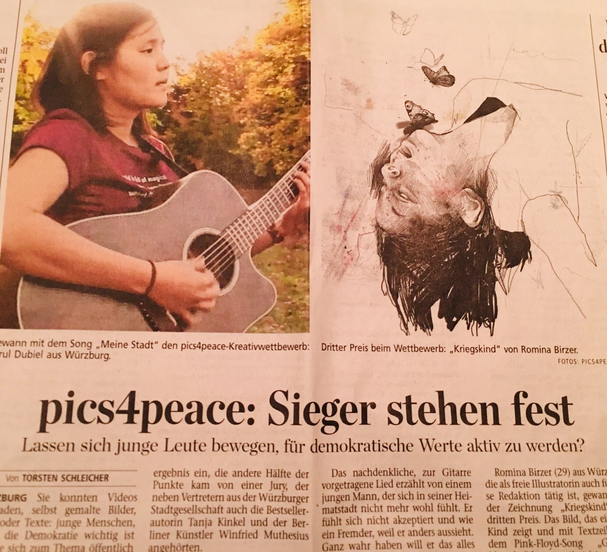 Spannender Artikel von Torsten Schleicher, Lokalchef der Mainpost, über den pics4peace Kreativ-Wettbewerb" Gegen Extremismus, für Demokratie", das Verfahren, die Jury, die Siegerbeiträge mit Interview-Auszügen der Preisträger, und wie es weiter geht, in der Mainpost vom 24. Dezember 2018, S. 25.