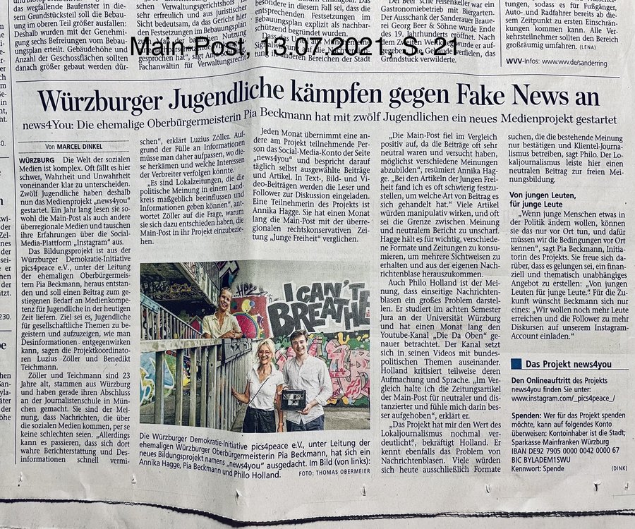 Heute hat die Main-Post über unser Projekt berichtet. Fotograf Thomas Obermeier schoss das Foto. Zum Gespräch standen Beni, Julius, Annika und Philo sowie Pia. Marcel Dinkel hat alle über eine Stunde interviewt. Seht, was er geschrieben hat. Hier zum Artikel online.