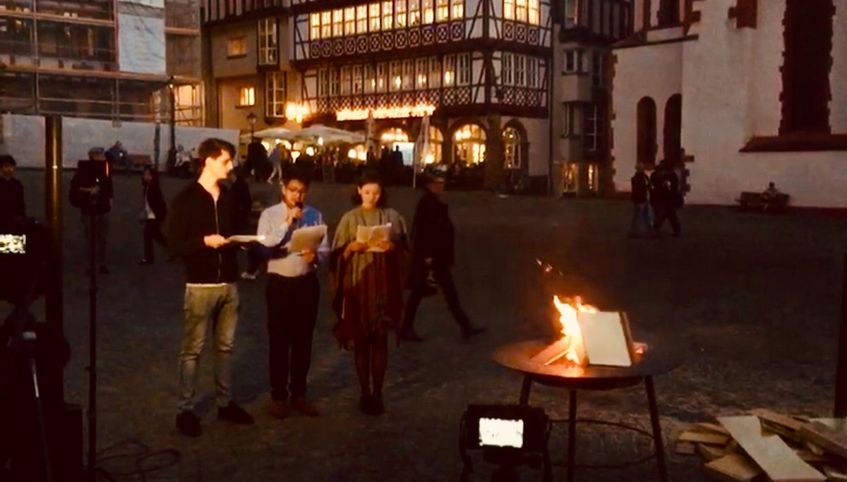 Für die Aktion dramaturgisch zusammengefasst wurden die Ergebnisse als Kondensat von Pia Beckmann in Kooperation mit den drei Vortragenden: Anna, 17, Tobias, 17, und Max, 22. Sie lesen mit verteilten Rollen, wie es damals bei der Bücherverbrennung 1933 vorgeschrieben war. Es gab eine Dramaturgie, die die Nationalsozialisten angeordnet hatten. Die Dramaturgie heute, die Texte von jungen Menschen langsam, eindringlich und ruhig vorgetragen, der Vergleich von dem, was damals passiert ist, mit dem, was heute wieder erlebbar ist, lassen Parallelen erkennen und wecken Emotionen. Das Bekenntnis „ICH WILL“ am Ende fordert dazu auf, einzustimmen und mitzumachen, sich gegen Extremismus zu engagieren. Insbesondere, da es von jungen Menschen kommt, mit Stimmen der Unschuld, die Krieg und Hunger nicht kennen und ihr Recht auf eine Zukunft in Demokratie, Frieden und Freiheit einfordern.