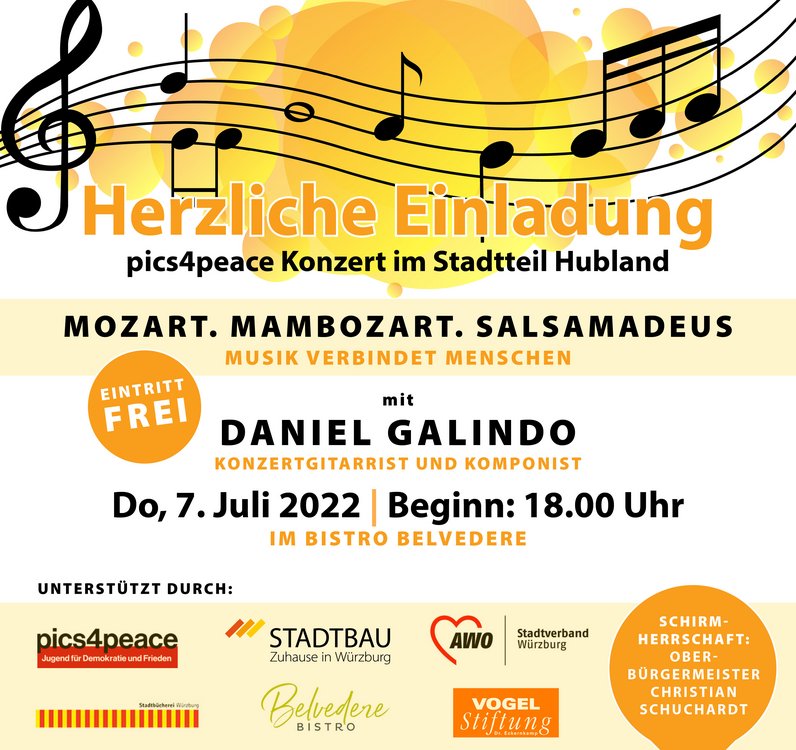 Ja, ob ihr es glaubt oder nicht, das gibt es. Daniel Galindo aus Lima in Peru, der, seit er hier in Würzburg ist, mit pics4peace zusammenarbeitet, beweist es. Er hat Mozarts Musik lateinamerikanisch umgesetzt und dafür eigens Stücke für die ursprünglichen Instrumente dieser Musik, nämlich Gitarre, sein Instrument, Percussion und Flöte geschrieben. Warum das? Er ist der Überzeugung Musik verbindet Menschen. Und damit ist er nicht allein. Er konnte sogar weitere Profis dafür gewinnen: aus Tokyo in Japan kommt Hazuki Kono, Flötistin, die aktuell - wie Daniel - ihren Master of Performance an der Hochschule für Musik in Würzburg absolviert; Aus Leipzig reist extra Michael Kock, Percussionist und Community Musician an, um mitzumachen.