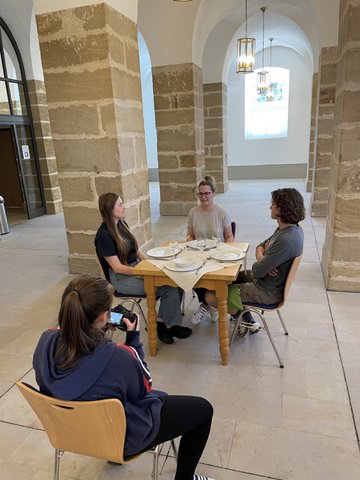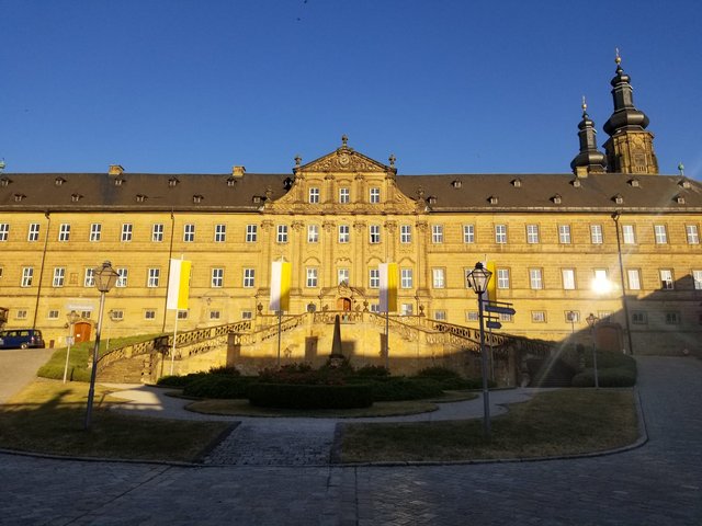 Ihr erinnert euch? Wir wollten hier im Anschluss an die Exkursionen nach Frankfurt, Nürnberg und München, über das 5-tägige deutsch-amerikanische Kunst-Camp berichten. Schon die Fahrt zu unserer Tagungsstätte mit Zug und Bus war ein Hallo. Unsere amerikanischen Gäste waren begeistert, als hoch über dem Maintal, von Weitem sichtbar, das idyllisch gelegene "Schloss" am Banzberg auftauchte. Vormalig Benediktiner-Kloster, dient Kloster Banz, in dem wir dankenswerterweise unser Kunst-Camp durchführen durften, heute als Tagungs- und Bildungsstätte für Jung und Alt.