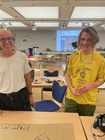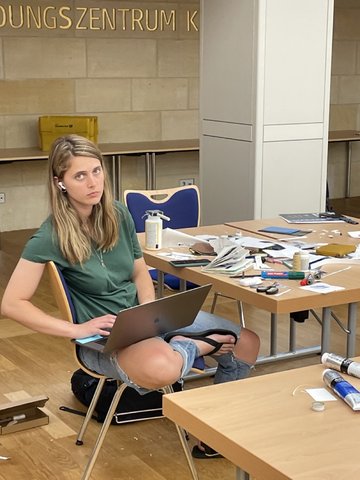 Ein großer Multimedia-Saal fungierte als Gemeinschafts-Atelier. Für Interviews und Aufnahmen durften wir auch das Tonstudio oder die Außenanlagen nutzen. Da die Rezeption Tag und Nacht besetzt war, konnten die Künstler*innen außerhalb der Seminarzeiten immer ins Atelier, wenn sie weitermachen oder eine spontane Inspiration umsetzen wollten. Nach dem gemeinsamen Abendessen, gingen die meisten eine Runde ins hauseigene Schwimmbad. Danach saßen wir meist auf der Terasse und tauschten uns über unsere Erlebnisse und Erfahrungen aus, bevor wir uns in die Nacht verabschiedeten. Denn es hieß, früh aufstehen.Schon vor dem Frühstück lud Winfried alle Interessierten zum Yoga im Freien ein. Dann schnell Duschen, um 7.30 zum Frühstück. Danach wieder ins Atelier.