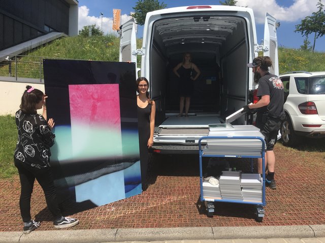 Während des gesamten Festivals gibt es außerdem eine Ausstellung von 2 m hohen Bildern, die an der Zeltdecke aufgehängt werden. Junge KünstlerInnen haben sich, nach der Technik des Berliner Künstlers Winfried Muthesius Gedanken darüber gemacht, was sie in unserer Gesellschaft ändern wollen. Es sind mehrschichtige großformatige Kunstwerke entstanden, die Aktionskunst, Malerei und Fotografie zusammenführen und übereinander gelagert das jeweils eigene Thema von der Vergangenheit, über die Gegenwart bis zu einer Perspektive in die Zukunft aufrollen. Texttafeln erklären die Hintergründe. Dabei geht es z.B. um Machtmissbrauch, die Frage nach der Norm, um Meinungsfreiheit in einer immer stärker digitalisierten Welt, Gewalt gegen Frauen, Umwelt- und Tierschutz u.a.m. Dazwischen hängen Texttafeln, die erläutern, was sich die jungen KünstlerInnen dabei gedacht haben. Die Verbindung von Bild und Text lässt niemanden kalt.