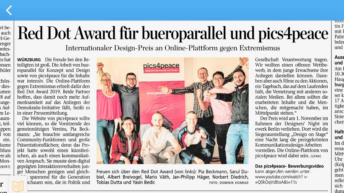YEAH! Die Freude ist groß! Die intensive Arbeit von unseren Website-Machern "bueroparallel", die für Konzept und Design stehen, sowie von pics4peace für die Inhalte hat sich gelohnt. Unsere Online-Plattform gegen Extremismus erhielt den Red Dot Design Award 2019.